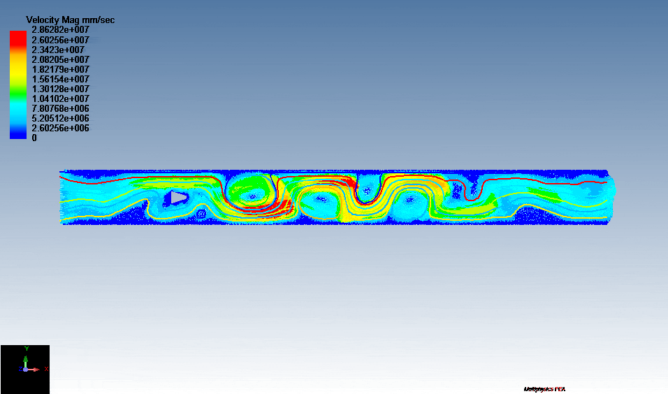 二維流體動態分析。流體在通過梯形結構後產生渦流,渦流產生頻率與流速相關,通過計數渦流頻率可以求出流量。