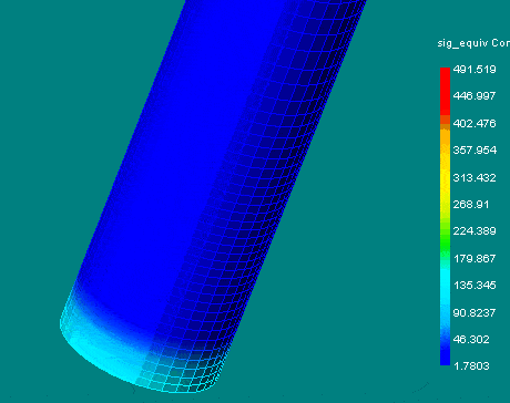 靜態分析也能進行分步分析。如右圖,靜態分析直接壓到低,這樣僅能看到圓柱最終被壓潰的結果。而使用分步命令後,上板逐漸下壓,我們能夠得到零件逐漸壓潰的過程。