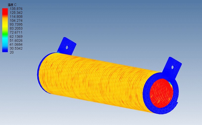 散熱片設計。圖中紅色為通電後正常工作的晶片,工作中產熱,因此顯示為紅色,溫度最高。與晶片相連結構為散熱片,熱根據圖中的流線導走,深藍色溫度最低。