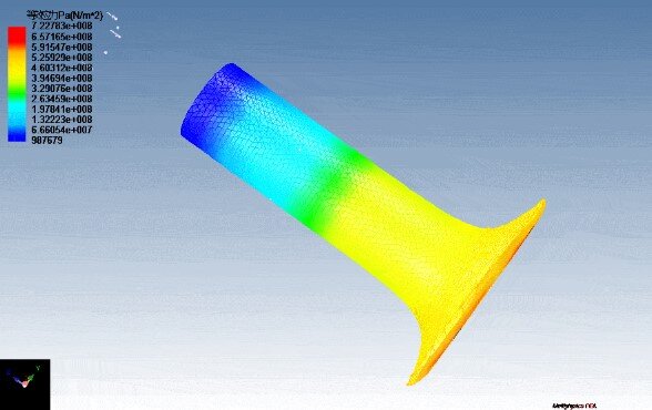 施加轉速約束的葉輪力學分析。葉輪旋轉的離心力造成結構應力。紅色區域應力集中,需謹慎對待。