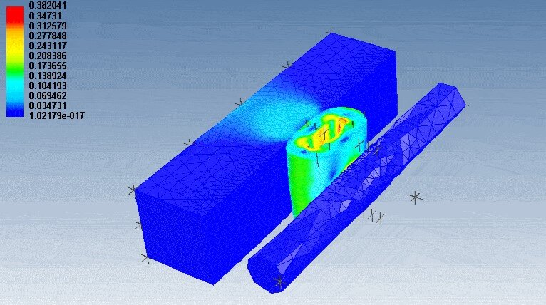 流體、結構應力耦合分析。水流產生的力施加在閥體形成應力分佈。 IRONCAD MULTIPHYSICS與市場上其他CAE工具不同,直接耦合流體、應力物理性,由此才能準確分析這類問題。
