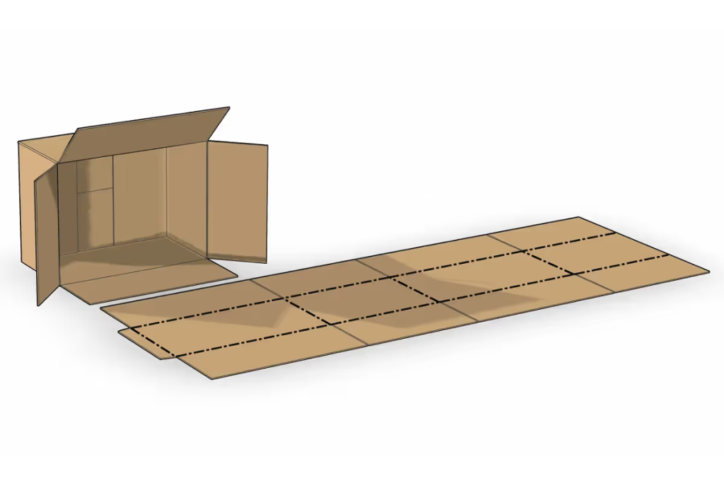 當您完成圍繞待運送物品或紙箱內部的客製化包裝設計後,只需點擊一下即可將其展開。系統內建了用於計算不同材料的折疊、切割和展開尺寸的預定義規則。不同的線條類型包含了在指定位置切割或折疊瓦楞紙板的資訊。展開後的版本可以快速輕鬆地匯出為 2D DWG/DXF 格式,供生產使用。